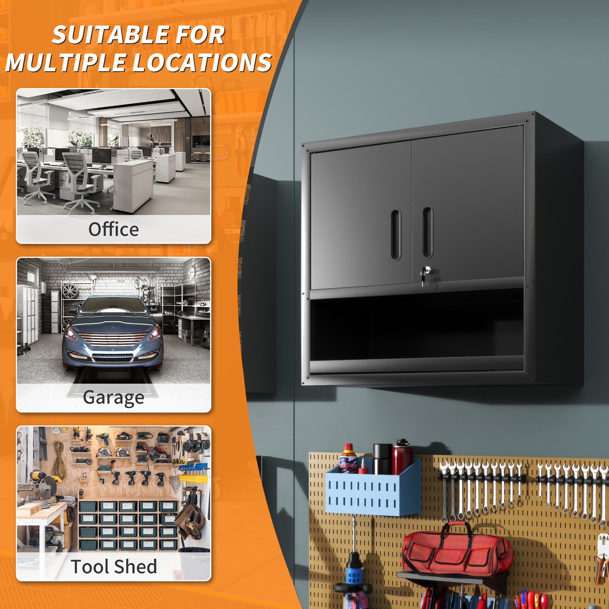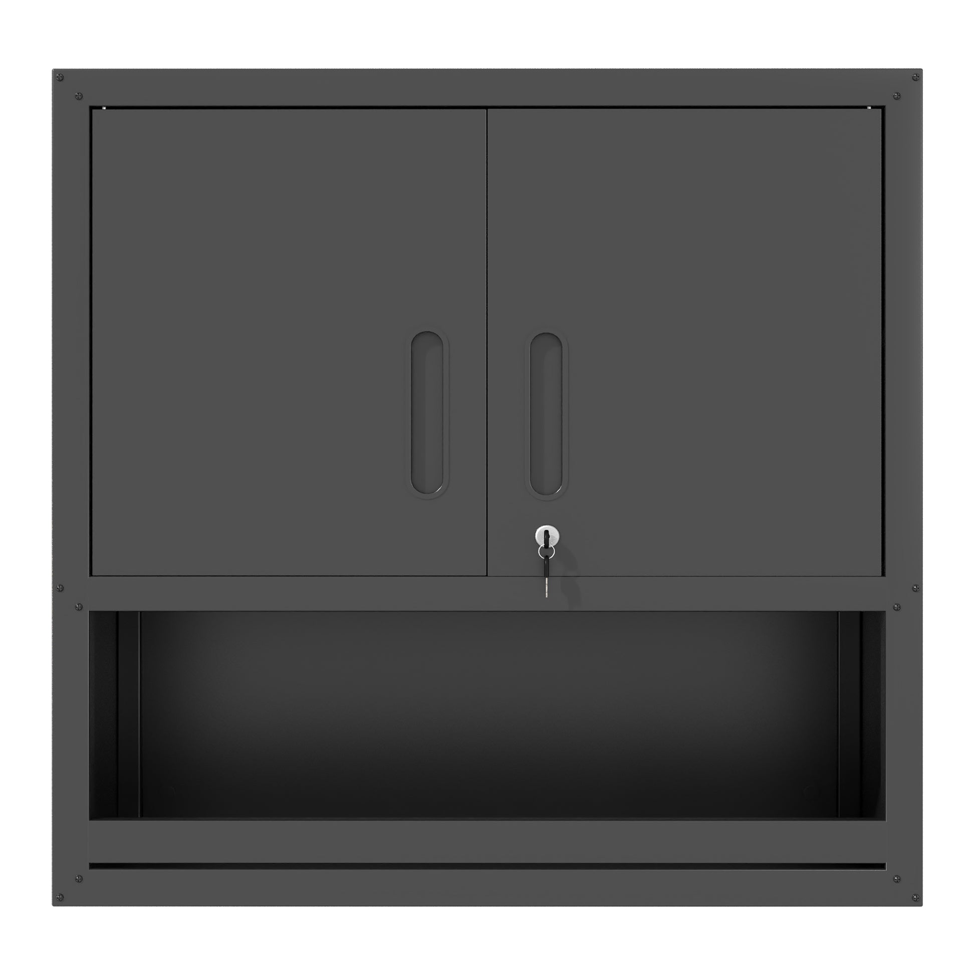 VIYET 30"H Wall-Mounted Steel Cabinet - Locking Doors + Open Drawer + Adjustable Shelf, Cold-Rolled Steel with Rust-Resistant Coating, Black for Garage/Office/Warehouse/Home/School