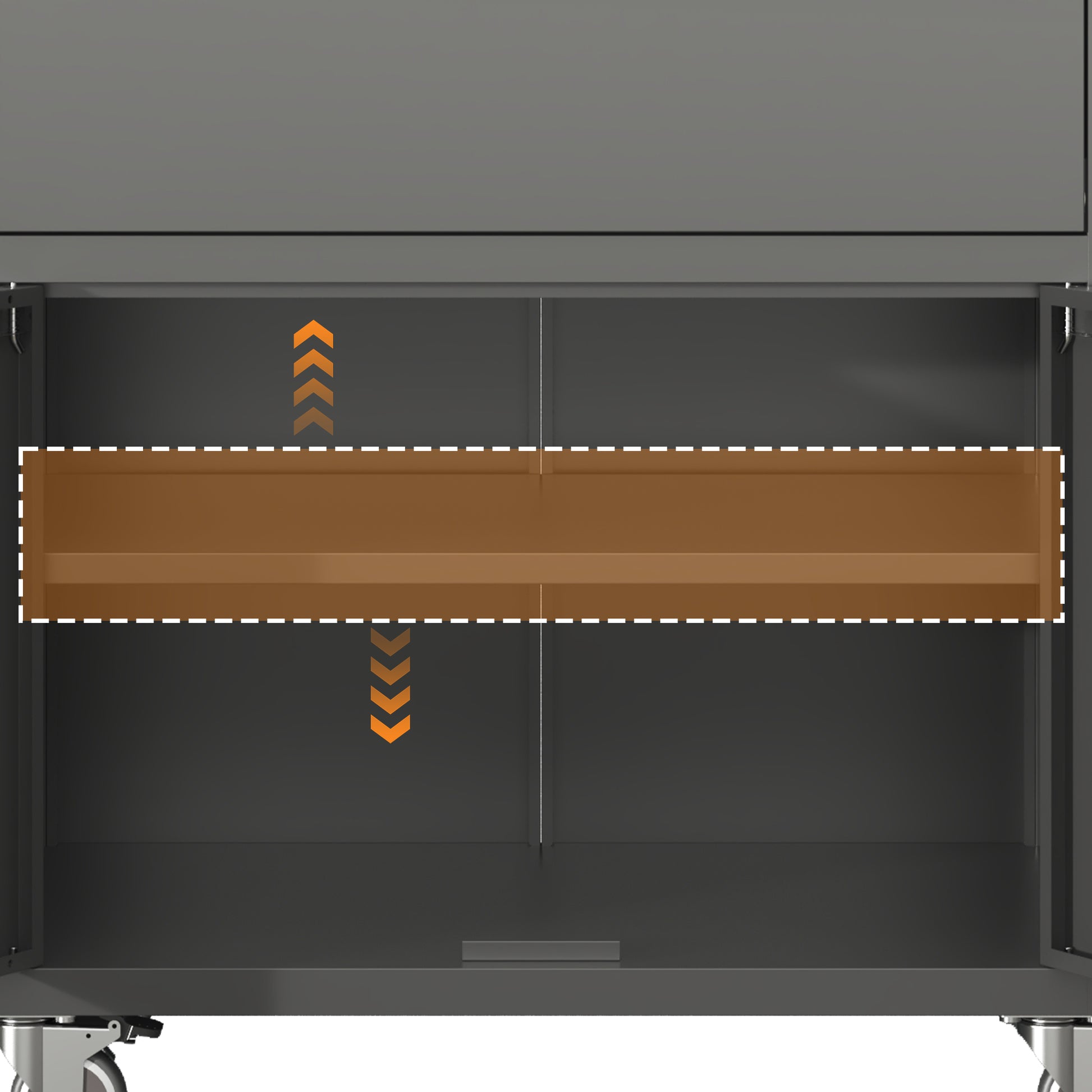 Mobile & Stable for Every SpaceEquipped with 4 detachable 360° lockable casters, this cabinet glides smoothly across floors—effortlessly move it from garage to workshop or office to pantry. Lock the casters in place for stationary use, or remove them entirely for a fixed storage solution. The ergonomic metal round tube handle ensures comfortable maneuvering, even when fully loaded.